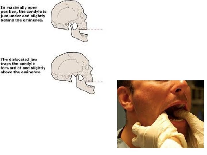 • Luxation is characterized by sudden locking & immobilization of the jaw when the mouth is open, accompanied by prolonged spasmodic contraction of masticatory muscles with protrusion of mandible. • Patient will not be able to close the mouth & all activities such as talking, eating are impossible.