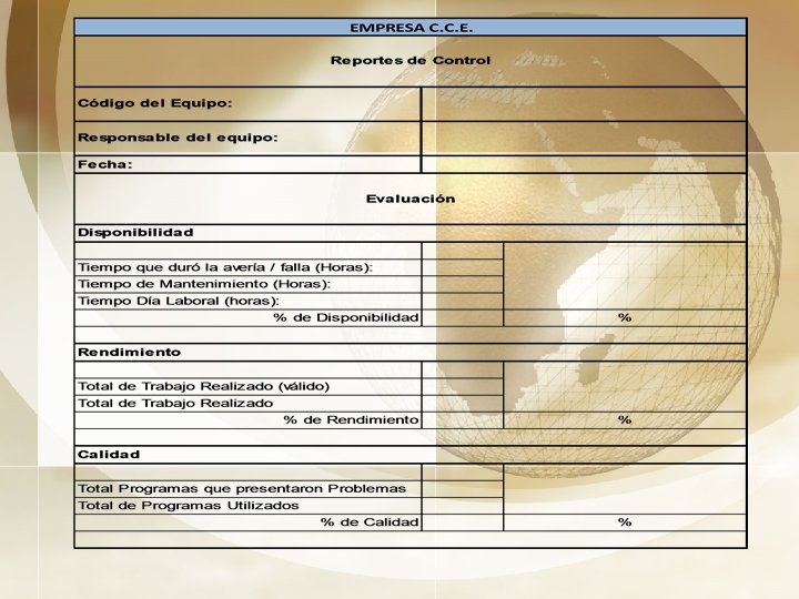 Ø Evaluar el desenvolvimiento de los equipos, valorando su eficacia y eficiencia por medio del rendimiento, calidad y disponibilidad de equipos críticos. ØFallas o averías sean manejables y en algunos casos sean evitables. Análisis de la matriz Efecto- Falla, acciones correctivas, historial de fallas y toma de acciones.