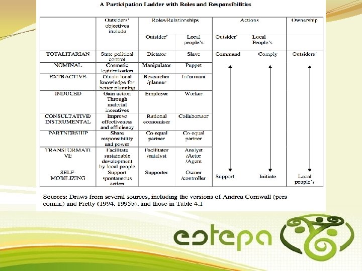 CARTOGRAFÍA PARTICIPATIVA y SIG P: Algunos conceptos y ejemplos ¿Que se entiende por participación? Espacio-población - Intensidad de la participación (transferencia de poder para la toma de decisiones) - Intención de la participación (intereses de los actores) Cartografía participativa Tema Actores participantes -Rol de los participantes y los facilitadores / investigadores