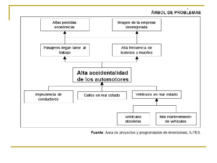 El análisis de problemas Es una herramienta útil para: n Realizar análisis de situación referido al contexto del problema seleccionado. n Identificar los problemas principales asociados al problema bajo consideración y ver sus relaciones de causalidad (causa – efecto), determinación y condicionamiento. n Identificar los nudos críticos que explican el problema. n Visualizar esas relaciones en un diagrama / Árbol de Problemas