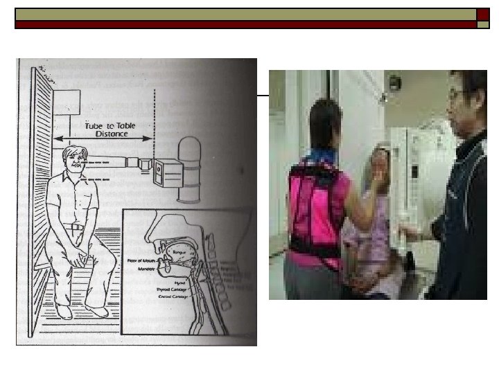 MBS (Modified barium swallow) o Dynamic recordings using air-contrast exams both in the upright and recumbent positions o Assess pharyngeal anatomy and motility o Most have a speech pathologist present o Superior to FEES for evaluating the oral phase and aspiration