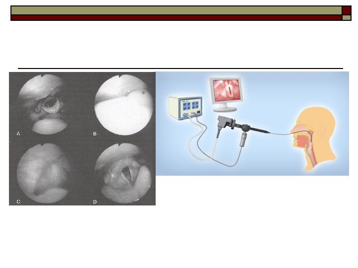 FEES (Fiberoptic endoscopic evaluation) o o o Directly viewing liquid or food bolus via scope Positioned high in oropharynx Observation of n n n o vocal and arytenoid movements Elevation of larynx and tongue base Management of residuals Pooling and aspiration can be noted