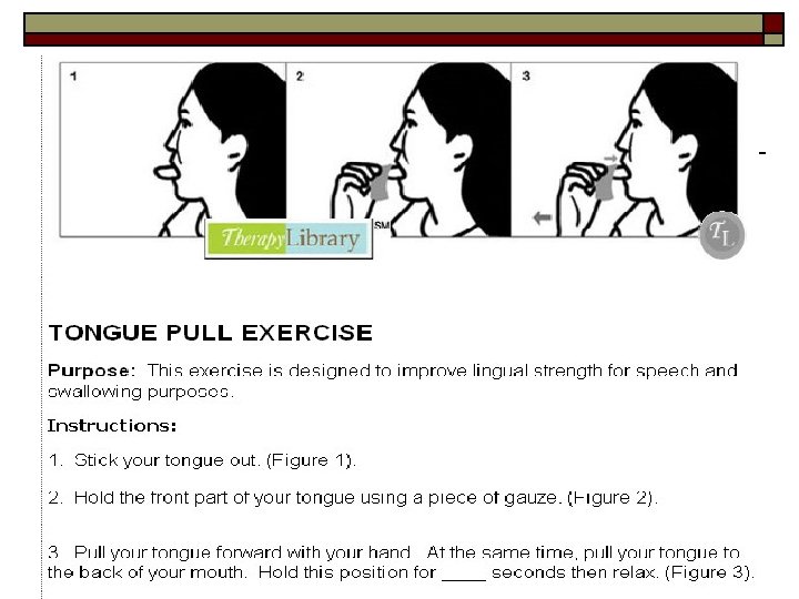 Lingual strengthening exercise Effects: o Improve tongue strength o Increase swallowing pressure o Improved penetration-Aspiration scale scores