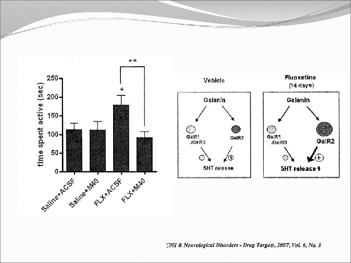 Galanin 29 -AA peptide neurotransmitter. In CNS, expressed in regions implicated in mood anxiety – hypothalamus, amygdala, LC, d. RN, VTA. Coexists with NE ~80% LC neurons. Voluntary exercise increases prepro. GAL m. RNA in the LC. -Chronic social stress & Chronic Fluoxetine increases GAL in LC (& GALR 2).
