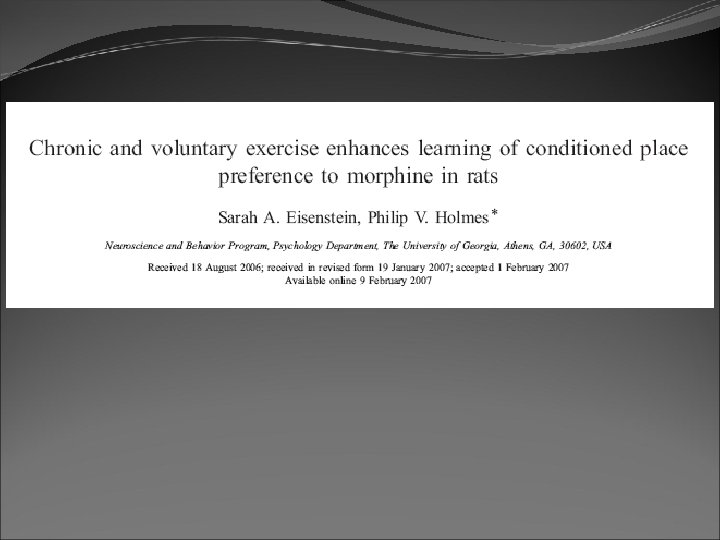 Running rats exhibit withdrawal signs (increased aggression) when access to the running wheel is denied. DFos B – up-regulated in reward pathways after addictive drugs and voluntary wheel running. DFos B over-expression increases running activity and increases sensitivity to rewarding effects of morphine. Rodents display conditioned preference to an environment associated with running “after-effects” Attenuated by naloxone. Repeated activation of opioid systems by running could possibly change sensitivity to morphine.