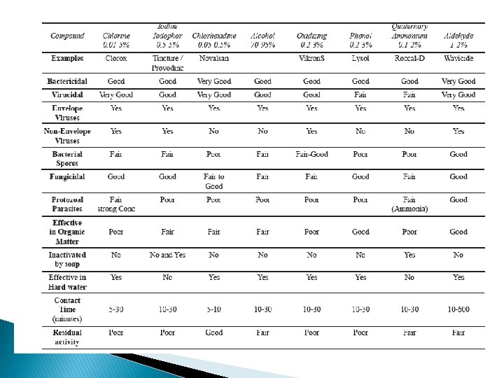 Factors affecting disinfectant � The presence of other materials in or on the surfaces to be disinfected can have an effect on the activity of the disinfectant. ◦ ◦ The presence of organic material, other chemical agents including soaps and detergents Water p. H Water temperature ◦ Disinfectants have important cleaning qualities however may not always be effective against all forms of bacteria, viruses and fungi. As a result, some equipment such as surgical instruments should be sterilised