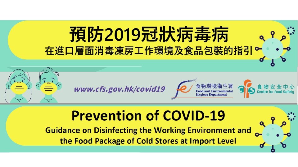 消毒方法 Use of Disinfectants u 貨物外包裝,在運入倉庫或裝載送貨前,應使用 1比 99稀釋的家用漂白劑作為消毒 1: 99 diluted household bleach should be used for disinfection of outer package before bringing into warehouse or loading for delivery u 以拭抹或噴灑方式進行 By wiping or spraying u 在空氣流通的地方進行 To conduct under well ventilated areas u 以免食品受消毒劑污染 To prevent the contamination by disinfectants u 食物包裝與消毒 Food Package vs Disinfection
