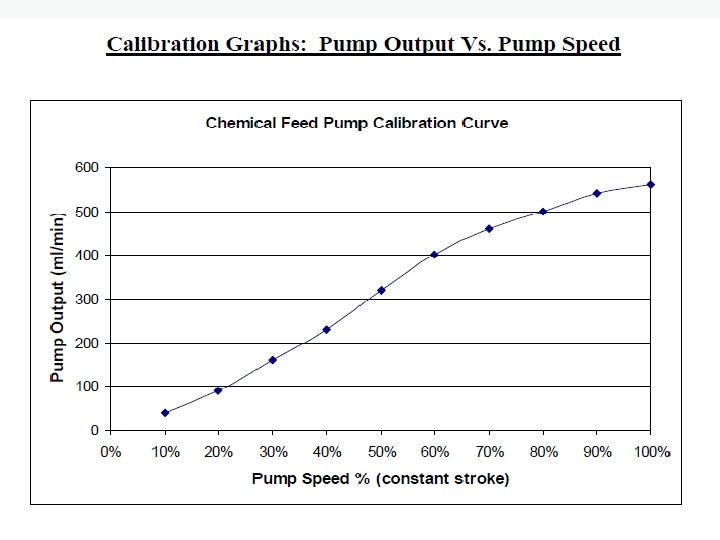 Instrument calibration • Chemical feed pumps – Calibration measures both the speed and the stroke (amount of chemical pumped) so accurate dosages can be calculated – Create a “pump curve”; • Set the stroke at half way point • On a graph, plot speeds of 10% to 100% on X axis • Plot chemical output amount on Y axis (ml/min) • Record drawdown in graduated cylinders for 1 minute