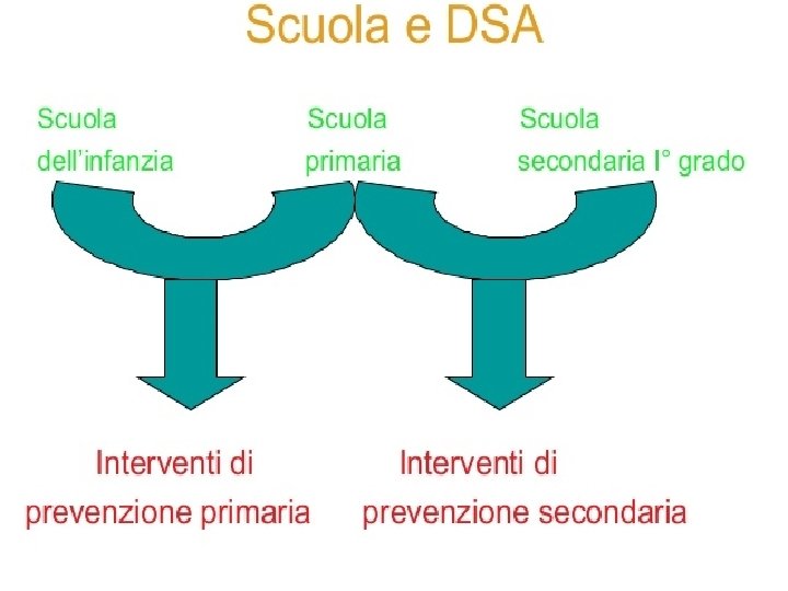 • Cosa può fare la scuola per l’individuazione del rischio e la prevenzione dei dsa nella scuola dell’infanzia? Aumentare l'attenzione e proporre specifiche attività educative e didattiche. Si sottolinea, che nella scuola dell'infanzia non è previsto effettuare invii al servizio specialistico per un sospetto di DSA. Solo i bambini che presentano già un disturbo del linguaggio conclamato o altri disturbi significativi, che possono o meno avere come evoluzione un DSA, dovranno essere avviati ad un percorso diagnostico e ad eventuale presa in carico specialistica prima dell'ingresso nella scuola primaria. L'identificazione delle difficoltà di sviluppo può essere attuata attraverso lo strumento dell'osservazione sistematica. In ogni caso, la realizzazione di percorsi formativo-progettuali per I'intero gruppo di bambini, che va anteposta alla segnalazione alle famiglie per l'invio ai servizi sanitari, deve comunque costituire materia di dialogo e di scambio educativo con le famiglie stesse, al fine di individuare e di condividere i percorsi migliori per ciascun singolo bambino.