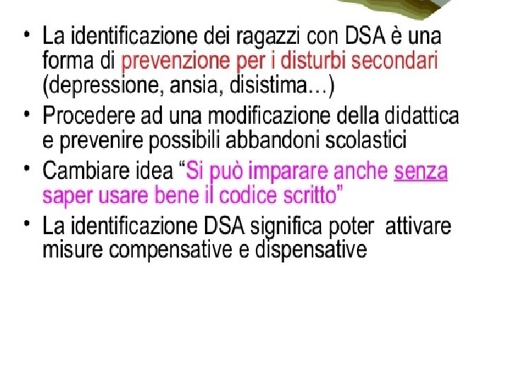 FATTORI DI RISCHIO • Familiarità • Scarse abilità metafonologiche • Ritardo delle competenze grafo rappresentative (disegno narrativo) • Ritardo nelle acquisizioni prassiche più complesse (allacciarsi le scarpe) • Pregresso e concomitante Disturbo del linguaggio FATTORI di richiesta ATTENZIONE • Difficoltà a mantenere l’attenzione • Difficoltà visuo spaziali • Difficoltà di coordinazione motoria