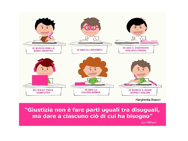 Il paradigma dell'inclusione si basa sulla diversita’ e sulla valorizzazione di essa. Non è possibile utilizzare per tutti la stessa modalita’, la stessa risposta, lo stesso canale. Una redistribuzione piu’ equa delle strategie, delle risorse e quindi delle modalità permette a tutti di raggiungere l'obiettivo quindi un'ottica di INDIVIDUALIZZAZIONE, strategie diverse per uno stesso obiettivo.