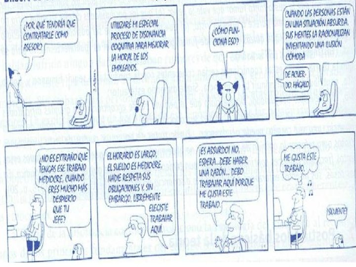 ¿Qué es la Disonancia Cognitiva? La persona cambia lo que dice a fin de no contradecir lo que hace. Si no lo hace cae en lo que se ha dado en llamar: DISONANCIA COGNITIVA “es cualquier incompatibilidad entre dos actitudes o entre actitudes y comportamiento”.