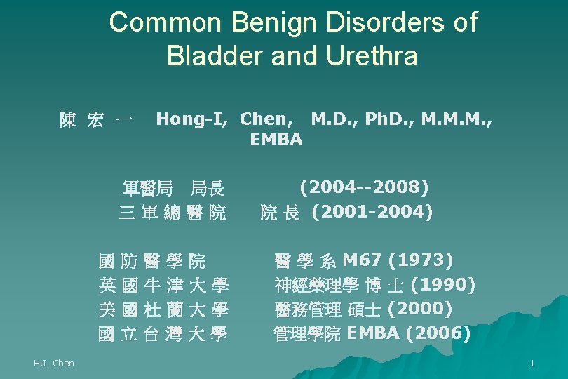 Disorder of the Bladder, Prostate, Urethra, Seminal Vesicle, Penis, & Genitalia u Anatomy and Histology (LOW URINARY TRACT) u Physiology and Pharmacology u Disorder u Diagnosis and Treatment u Prognosis H. I. Chen 2