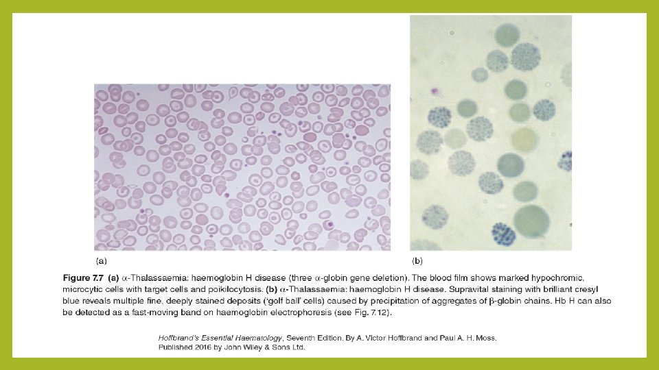 cont’d… ØMost patients are moderately affected, with a mild anemia of 7 -11 g/dl and markedly hypochromic, microcytic indices. ØSupravital staining of the blood film demonstrates cells with many Hb. H inclusions, giving a characteristic ‘golf-ball’ appearance. ØMost patients will be transfusion independent. ØSplenomegaly is seen in most patients.