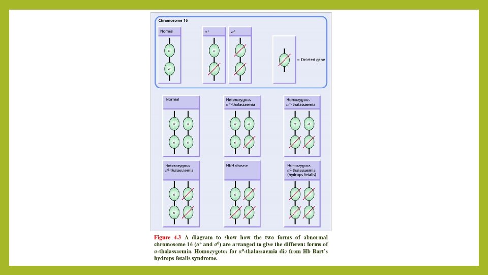 cont’d… v. Deletion of one or two genes causes an asymptomatic condition with minor hematological features; deletion of three of the four α-globin genes causes a more severe imbalance of α: β-globin chains and results in hemoglobin H, four beta globins, disease; and loss of all four α-globin genes causes Hb Bart’s, four gamma globins, (hydrops fetalis syndrome). v 0. 4% of deliveries are stillbirths due to Hb Bart’s hydrops fetalis syndrome and Hb. H disease is found in about 1% of the population.
