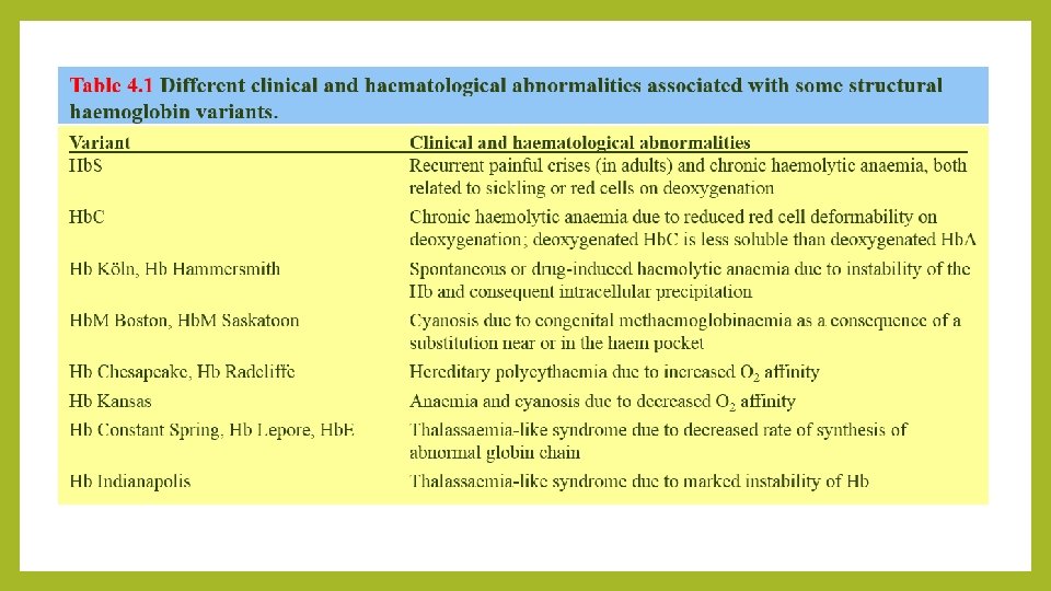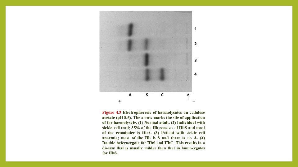 Structural Hemoglobin Variants Over 1000 abnormal hemoglobin variants have been reported. The majority of structural Hb variants are the consequence of a single-point mutation with a single amino acid substitution in the affected globin chain (e. g. Hb. S, Hb. E, Hb. C and Hb. D). • When the amino acid substitution results in an overall change in the charge of the hemoglobin molecule, its migration in a voltage gradient is altered and this can be demonstrated by standard electrophoretic techniques. The speed of migration is characteristic for each abnormal hemoglobin. • Abnormal hemoglobin variants are now usually detected by high-performance liquid chromatography (HPLC). The most common structural Hb variant is hemoglobin S (Hb. S). •
