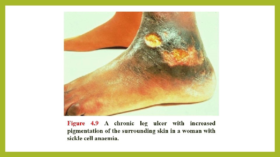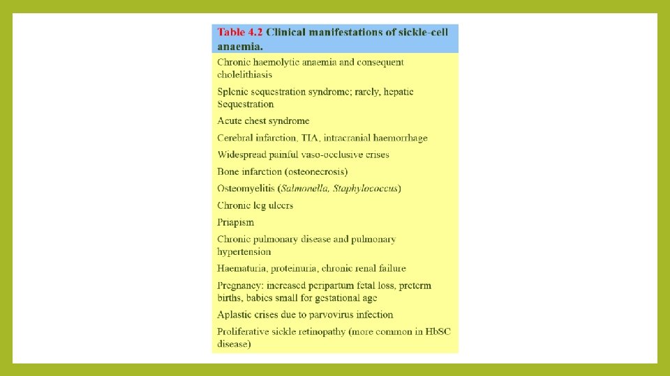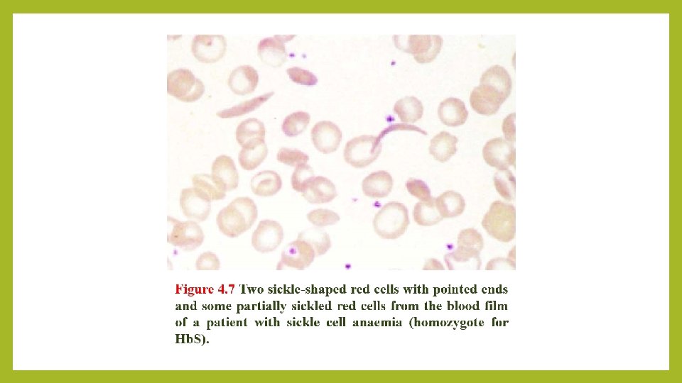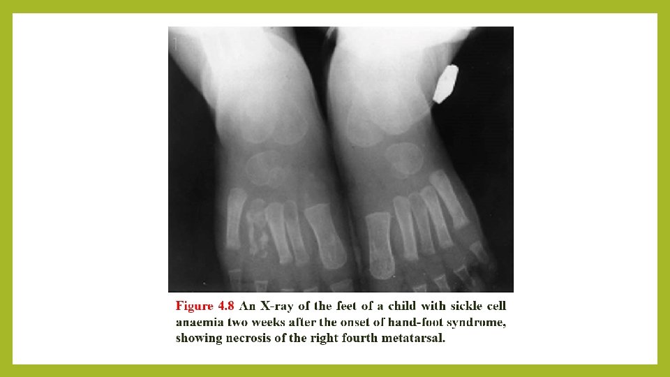 Diagnosis ØSickled cells are invariably present on the blood films of patients with Hb. SS is made by finding; Ø(i) a positive result with a screening test for Hb. S (Sickle solubility test); and Ø(ii) a peak at an appropriate position on an HPLC trace, confirmed by isoelectric focusing or hemoglobin electrophoresis. ØIn young children, a classic acute painful presentation is with dactylitis, or the ‘handfoot syndrome’, in which there is occlusion of the nutrient arteries to the metacarpals and metatarsals (Figure 4. 8) and painful swelling of the hands and feet. ØIn the central nervous system, cerebral infarction occurs in approximately 10% of patients under the age of 20, and is a cause of significant morbidity in sickle cell patients. It has been found that children with an increased velocity of blood flow in the major cerebral vessels are at particular risk of stroke.