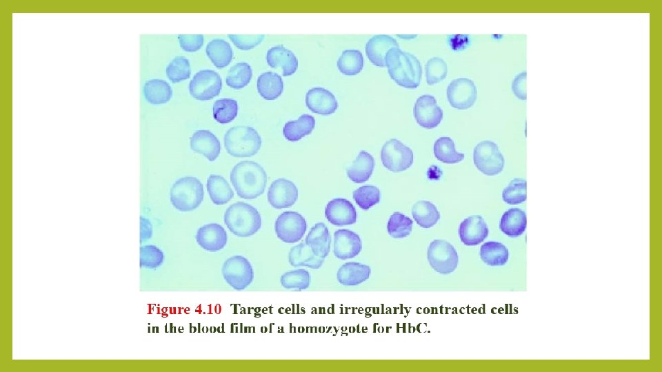 Hemoglobin E and C Among the commonest are Hb. E and Hb. C, both of which result from single amino acid substitutions in the β-chains. • Hb. E is very common in south-east Asia (being found in about 50% of the population in some parts of Thailand). • Hb. C is the consequence of a glutamine to lysine substitution in the β-globin chain. Hb. C is also seen in homozygosity; here the hemoglobin does not polymerize as with Hb. SS, but can crystallize, with a resulting reduction in the flexibility of the red cell and a reduction in its survival. • Homozygotes have a mild anemia, low MCV, splenomegaly and many target cells in their blood film. Hb. C is found in patients of West African origin. • When one allele being S and other being C or E, it is an example of a sickle cell disease (the most benign form is S/E).