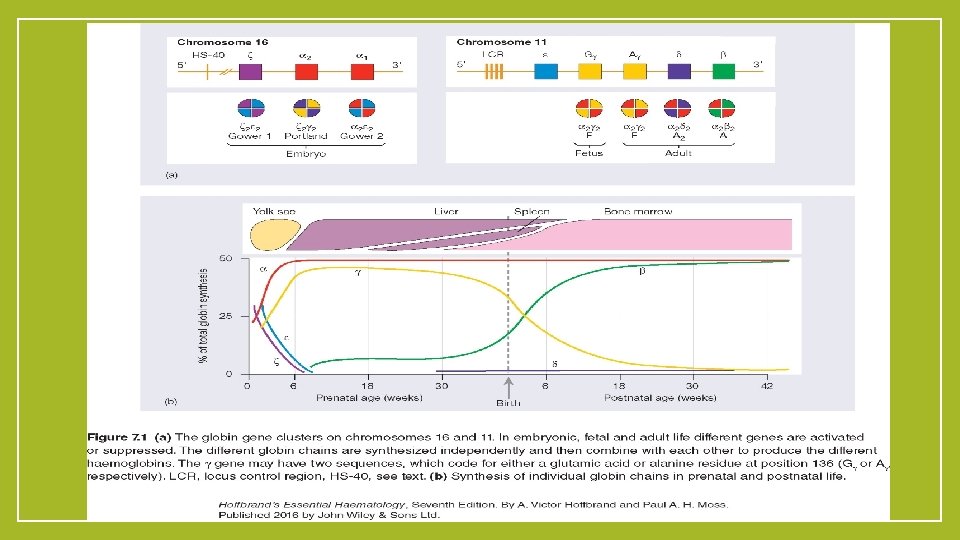 Normal Structure and function of Hemoglobin ØHemoglobin is critical to the normal function of the red cell, the fundamental role of which is the transport of oxygen from the lungs to the tissues. ØThe normal tetramer hemoglobin molecule comprises two ‘alphalike’ globin polypeptide chains and two ‘beta-like’ globin chains; each globin molecule is associated with a hem group, which comprises a porphyrin ring with iron in its ferrous form at the center. ØThe α chains are encoded on chromosome 16. ØThe β-like globins are encoded on chromosome 11.