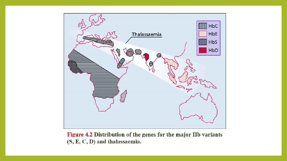 β-Thalassemia § The World Health Organization estimates that 1. 5% of the world’s population are carriers of β-thalassemia. The prevalence of the βthalassemia trait is particularly high in southern Europe (10 -30%) and south-east Asia (5%), common in Africa, the Middle East, India, Pakistan and southern China. § α-thalassaemia typically arises from gene deletions. § β-thalassaemia usually results from a multiplicity of different single nucleotide substitutions, insertions or small deletions affecting the βgene itself or occasionally in promoting regions.