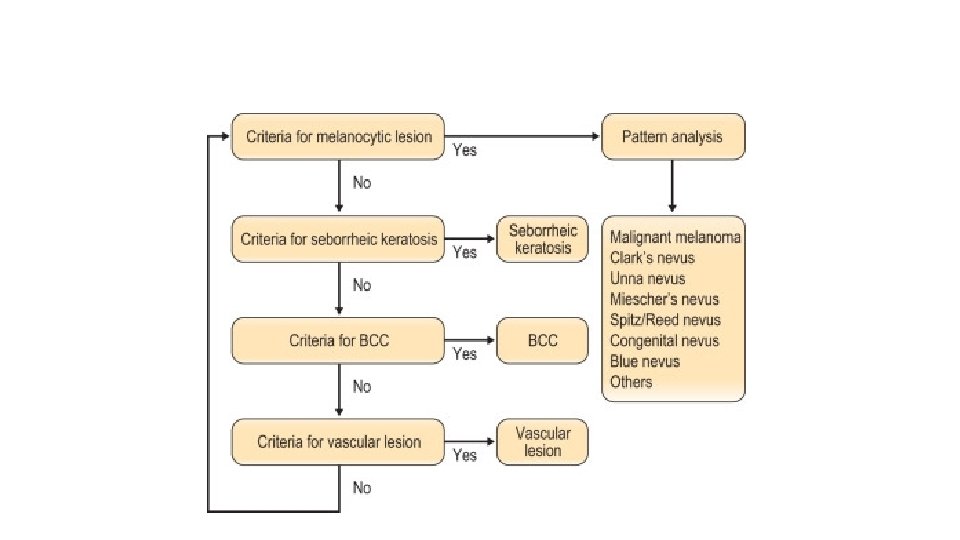 • first step is to differentiate melanocytic from nonmelanocytic pigmented lesions by using specific dermoscopic criteria. • second step is to differentiate between the various nonmelanocytic lesions by using other specific dermoscopic criteria