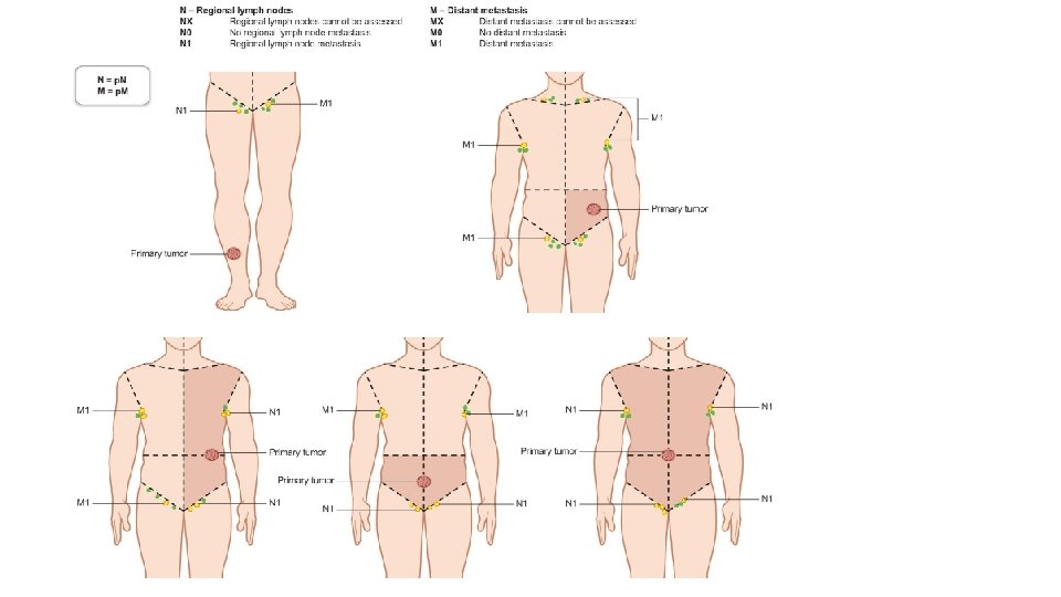 • Nx: Nodes are not assessable (e. g. , previously resected for other reasons) • N 0: No regional lymphatic metastases. • N 1: One involved lymph node. • N 1 a: clinically occult micrometastasis; • N 1 b: clinically detected macrometastasis • N 1 c: in transit or satellite metastasis without metastatic nodes • N 2: Two to three involved nodes • N 2 a: clinically occult micrometastases • N 2 b: at least one node with clinically detected macrometastasis • N 2 c: in-transit or satellite metastasis with one metastatic lymph node • N 3: Four or more positive nodes, matted nodes, or in-transit/satellite metastases with one or more positive nodes • N 3 a: clinically occult micrometastases • N 3 b: one clinically detected micrometastasis • N 3 c: two or more clinically detected micrometastases