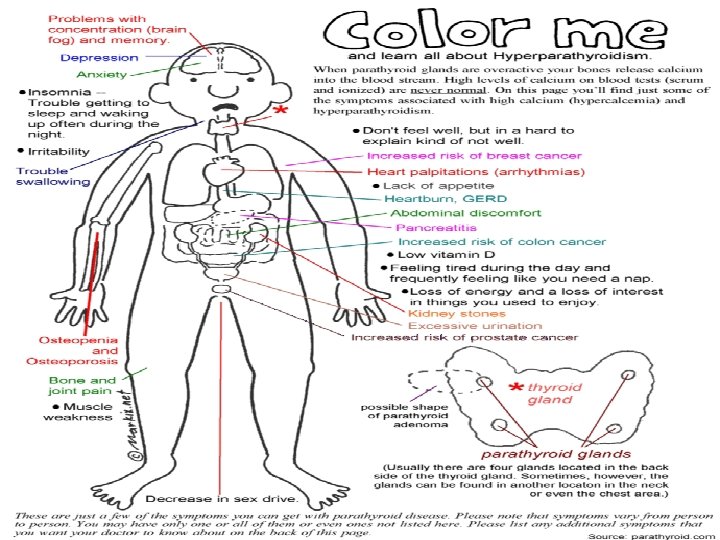 Disorders of the Parathyroid Function Clinical Features: The two major sites of potential complications are the bones and the kidneys. The kidneys may have renal stones (nephrolithiasis) or diffuse deposition of calciumphosphate complexes in the parenchyma (nephrocalcinosis). Now a days such complications are seen less commonly and around 20% of patients or less show such complications.