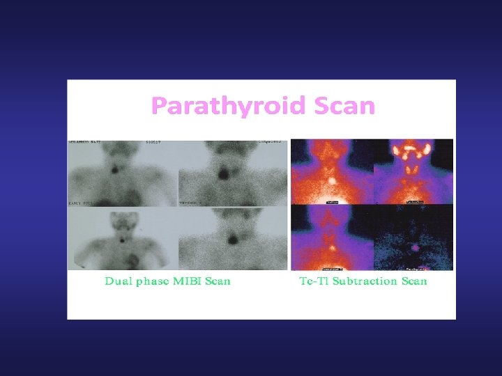 Other Diagnostic tests Pre-operative localization of the abnormal parathyroid gland(s): • • Ultrasonography MRI CT Thallium 201 – Tehcnichum 99 m scan (subtraction study) • Sestemebi scan