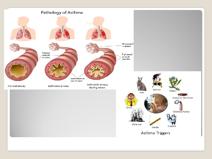 • Asthma is a respiratory disease of the bronchi and bronchioles. The symptoms include wheezing, shortness of breath, and sometimes a cough that will expel mucus. The airways are very sensitive to irritants which can include pollen, dust, animal dander, and tobacco. Even being out in cold air can be an irritant. When exposed to an irritant, the smooth muscle in the bronchioles undergoes spasms. Bronchial inflammation reduces the diameter of the airways and contributes to the seriousness of the attack. Asthma