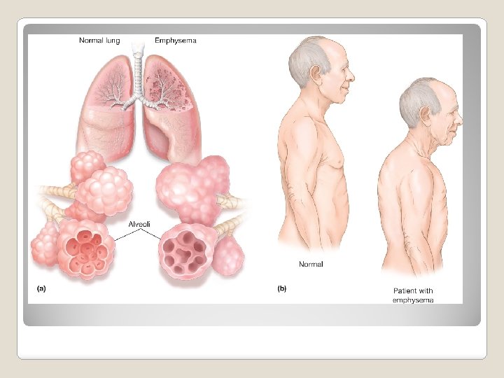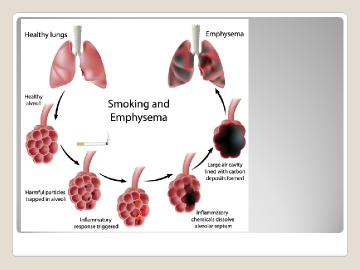 In this disorder, the walls of the alveoli lose their elasticity, which reduces the surface area available for gas exchange, causing oxygen shortage in the body. Symptoms include difficulty exhaling, low levels of oxygen in the body and a change in the shape of the chest (barrel back) to accommodate increased breathing volumes. The primary cause of emphysema is smoking. Emphysema