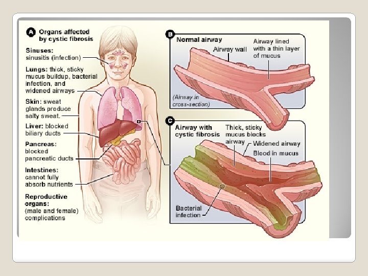 This is a genetic disorder that affects the consistency of the mucous that lines the air ways (and other mucous membranes in the body). Individuals with CF produce a thicker, sticky mucous that is difficult to clear from the airways, and can trap infectious agents leading to respiratory infections. Cystic fibrosis