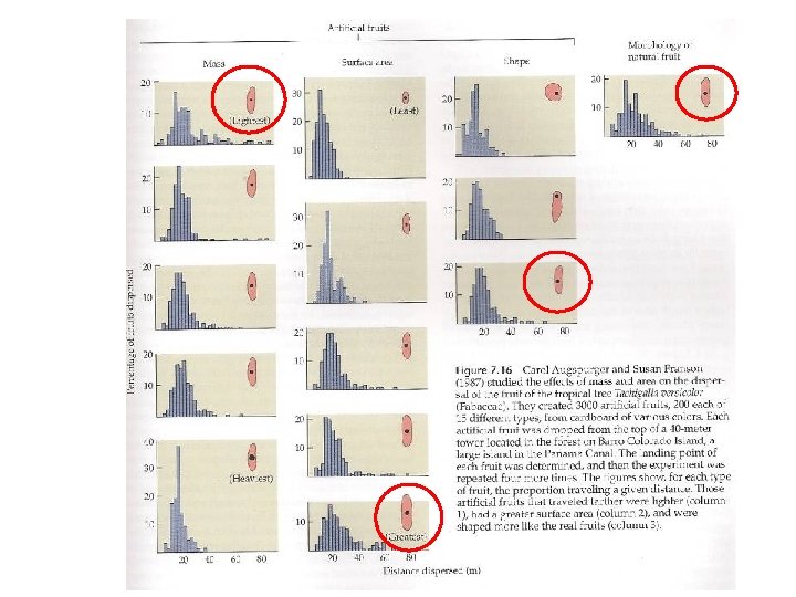 Varias hipótesis sobre dispersión • Modelos de inversión de recursos – Baja inversión: semillas pequeñas para dispersión a distancia – Alta inversión: más atractivas para dispersores mas efectivos • Hipótesis de dispersión dirigida: – Coevolución con dispersor para asegurar dispersión a lugar seguro
