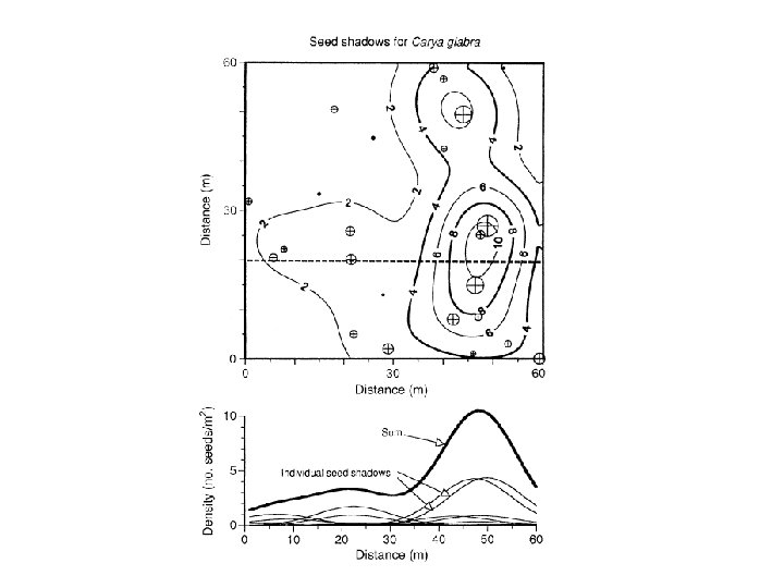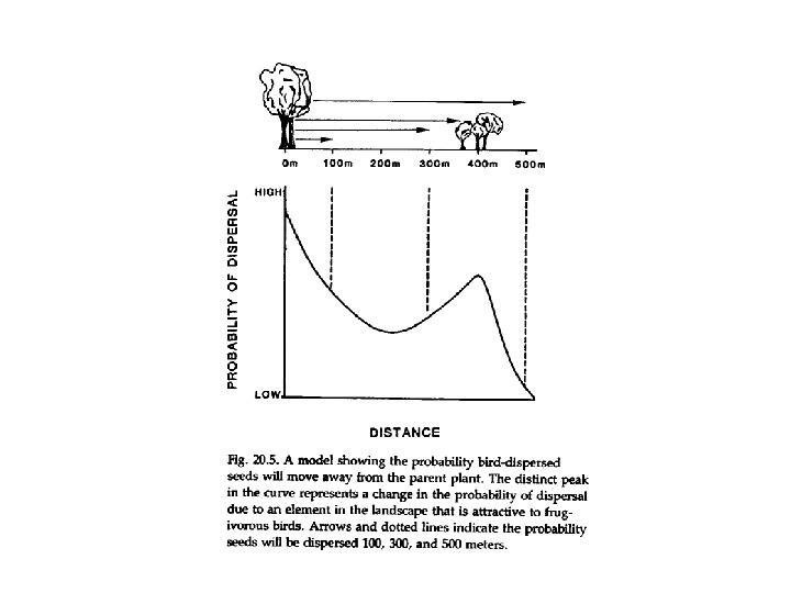 Patrones de dispersión cuando animales son los vectores • Patrón exponencial negativo cerca de la fuente pero con picos lejos de la fuente. • Los picos corresponden a focos de reclutamiento.