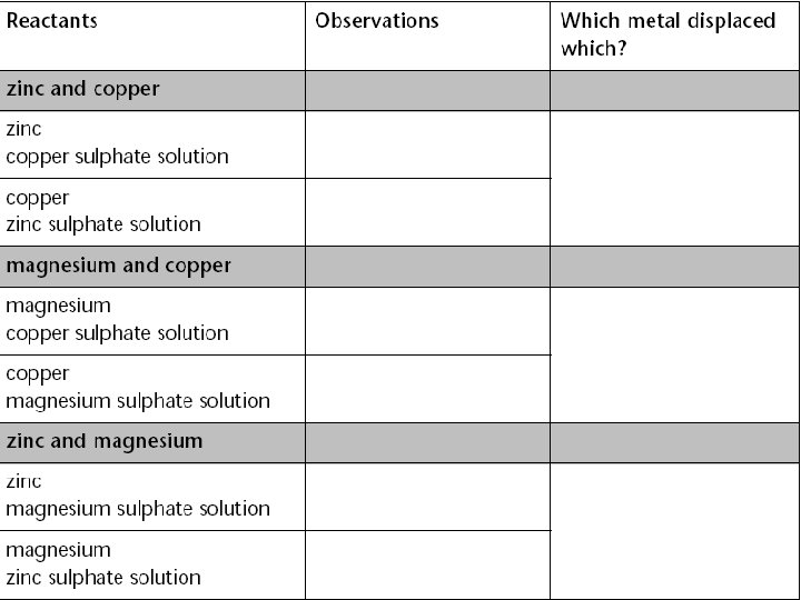 1. Which is the more reactive metal, zinc or copper? 2. Complete this word equation: 3. zinc + copper sulphate → + 4. Which is the more reactive metal, magnesium or copper? 5. Complete this word equation: magnesium + copper sulphate → + 6. Which is the more reactive metal, zinc or magnesium? 7. Complete this word equation: magnesium + zinc sulphate → +