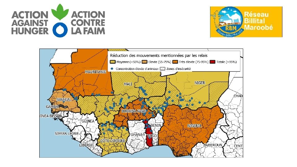 Tendance et contexte 1. Une réduction générale des mouvements des animaux entraînant de fortes concentrations • Mesures sanitaires de limitation des déplacements réduction des mouvements du bétail pour accéder aux ressources pastorales et fuir les zones en proie aux conflits, selon 60% des relais. • Concentrations d’animaux fonction de : i) la disponibilité de ressources pastorales stratégique, ii) l’existence et ouverture des marchés à bétail et iii) la présence d’opportunités liées à la proximité de centres urbains. Ces concentrations ont pour conséquence une pénurie d’eau et de pâturage et également un augmentation des rassemblements et concentration des personnes ; ce qui va à l’encontre des mesures sanitaires destinées à freiner la propagation du virus.