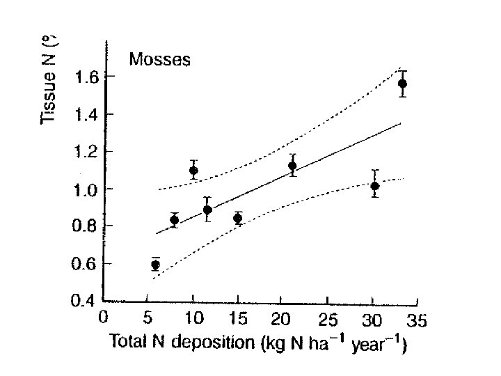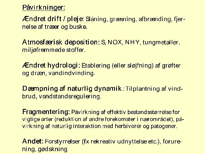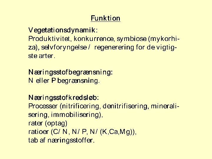 Forstyrrelser Øget Kvælstof-nedfald N tilgængelighed N optagelsen Stressfaktorer Ændringer i artssammensætning Fra N til P begrænsning N i biomasse Produktivitet Skud/rod Litter produktion Mykorrhiza N mineralisering N litter