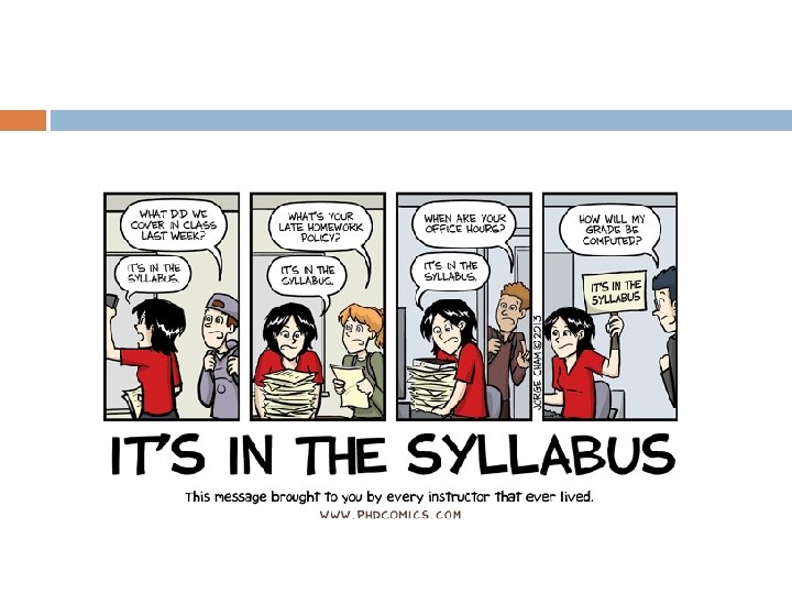 Syllabus: What is a syllabus? Your instructor hands you a syllabus on the first day of class (or posts it on Moodle), what is the first thing you do? Hopefully not this.
