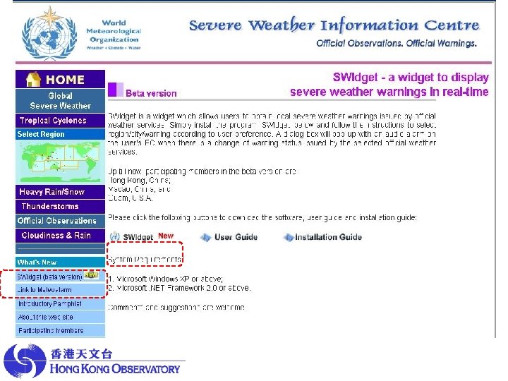 Mechanism of how the warning dissemination works Participating Member : decides the list of warnings to be made available maintain the warnings in their web server using a standard format (XML) Hong Kong Observatory provides: the standard format the ‘weather wizard’ facility on SWIC Users: go to SWIC and download a simple program to install on their PC select warnings and set preference receive the warnings (from participating member ) when they are in force.