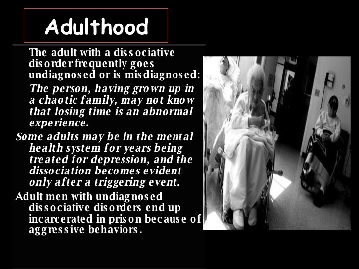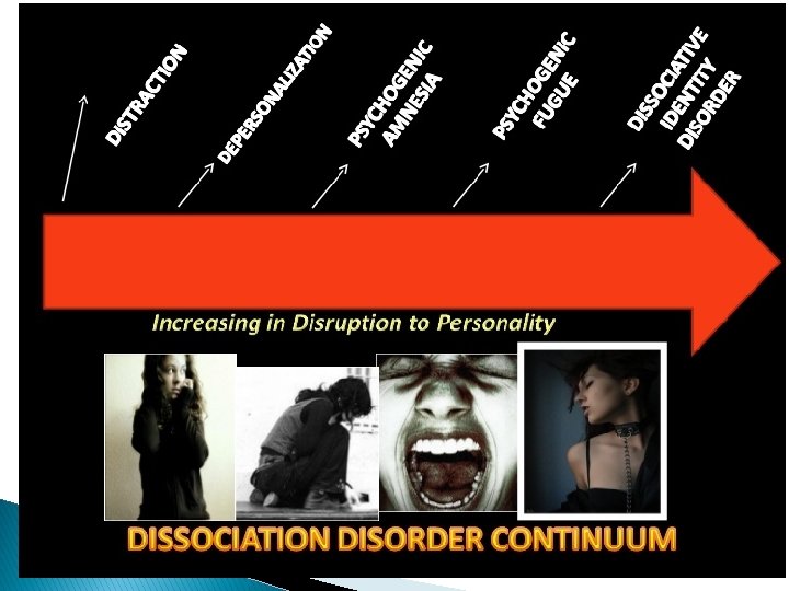 COMPLICATIONS OF DD � Without treatment, possible complications for a person with a dissociative disorder may include: Ø Life difficulties such as broken relationships and job loss Ø Sleep problems such as insomnia Ø Sexual problems Ø Severe depression Ø Anxiety disorders Ø Eating disorders such as anorexia or bulimia Ø Problematic drug use including alcoholism Ø Self-harm, including suicide.
