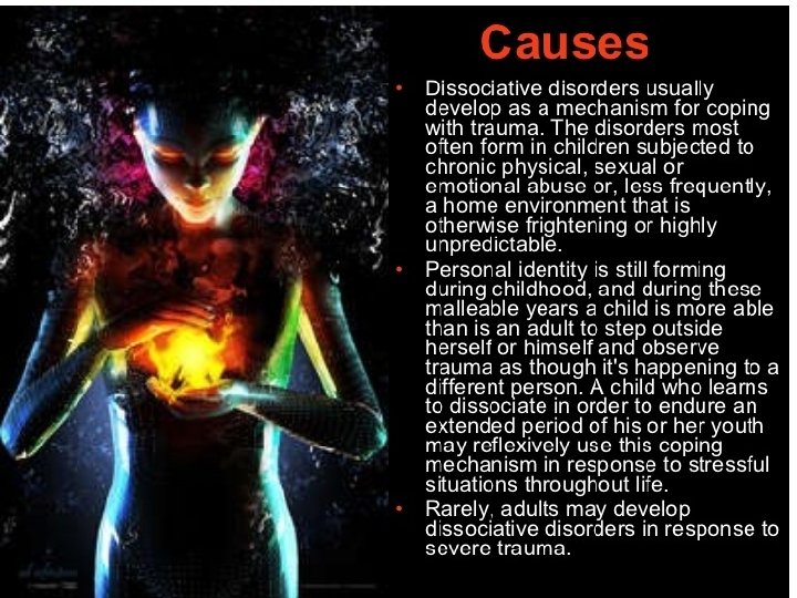 CAUSES � Most mental health professionals believe that the underlying cause of dissociative disorders is chronic trauma in childhood. Examples of trauma include repeated physical or sexual abuse, emotional abuse or neglect. � Unpredictable or frightening family environments may also cause the child to ‘disconnect’ from reality during times of stress.