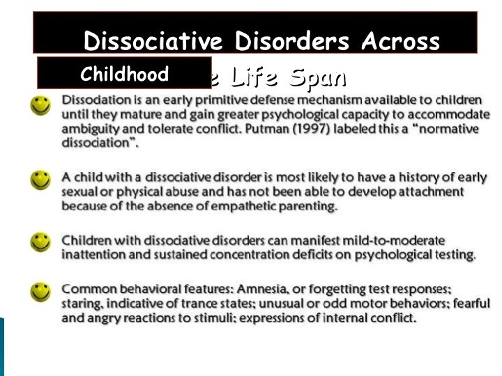 � Risk factor is psychological stress � Episodes of depersonalization are common � Usually in adolescence or early adulthood. Stressful events may precede the onset of the disorder. � Treatment is psychotherapy directed at decreasing anxiety � Major rule-outs are substance-induced mental disorders with dissociative symptoms, including intoxication, withdrawal, hallucinogen-induced persisting perceptual disorder, panic disorder, and PTSD.