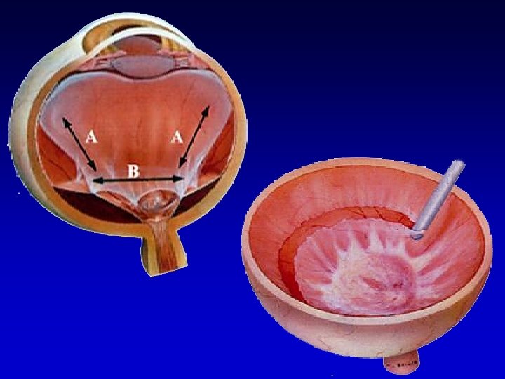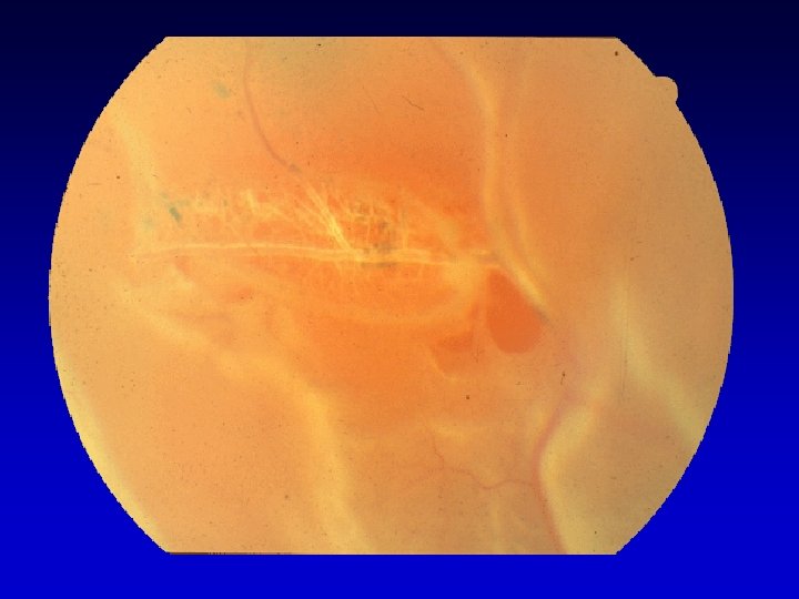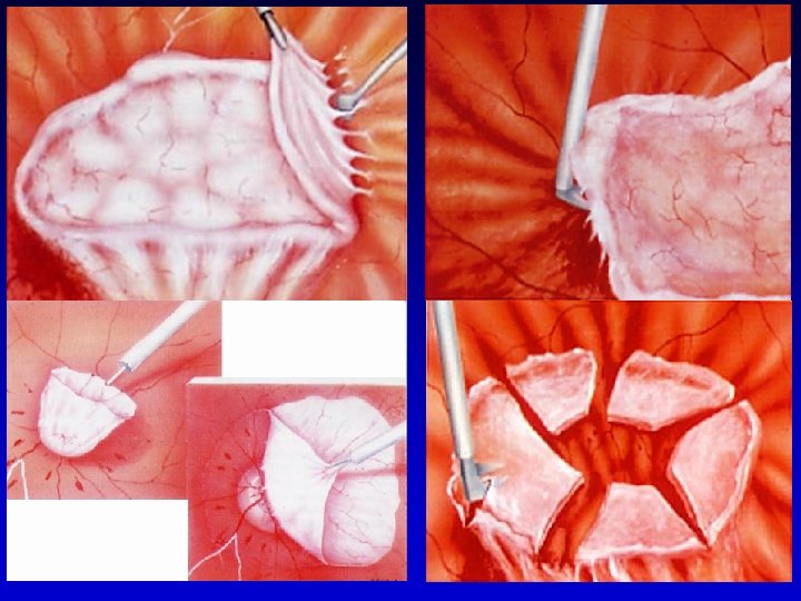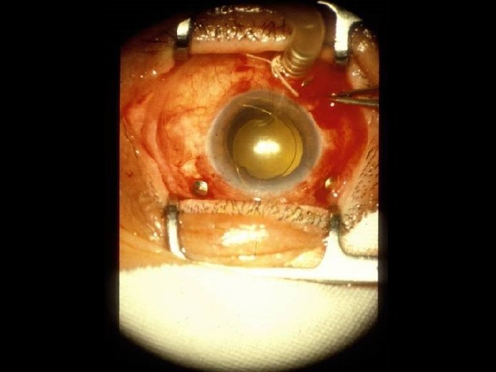 CHIRURGIA AB INTERNO Tempi operatori Apertura della congiuntiva e della sclera a 3. 5 -4 mm dal limbus Vitrectomia centrale e periferica Segmentazione delle membrane epiretiniche e talvolta sottoretiniche Immisione di sostanze reintegranti o tamponanti quali: Bss , aria, miscele di gas espansibili (sf 6, c 3 f 8, etc. . ) olio di silicone, doppio tampone Endodiatermia, fotocoagulazioine Sutura della sclera in vicryl 7/0 , della congiuntiva in vicryl 8/0