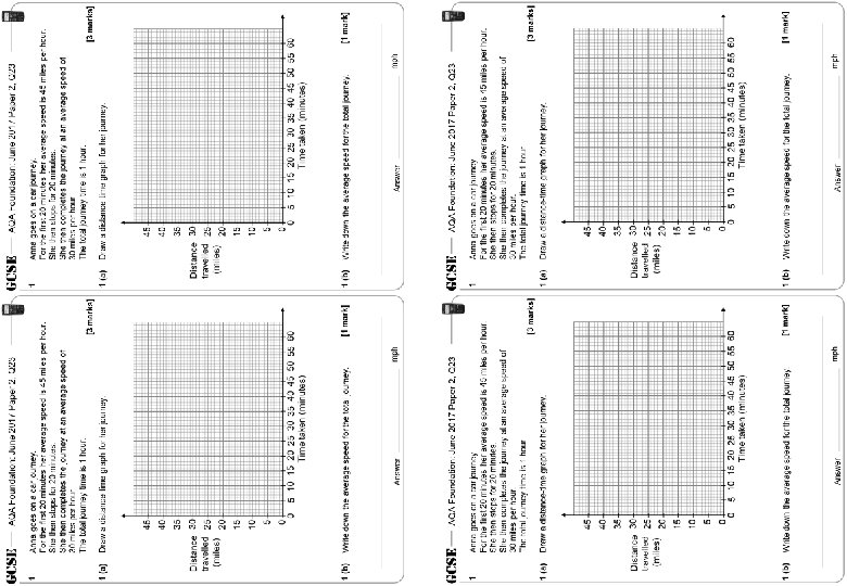 AQA Foundation: June 2017 Paper 2, Q 23 1 1 (a) Anna goes on a car journey. For the first 20 minutes her average speed is 45 miles per hour. She then stops for 20 minutes. She then completes the journey at an average speed of 30 miles per hour. The total journey time is 1 hour. [3 marks] Draw a distance-time graph for her journey. 1 (b) Write down the average speed for the total journey. Answer [1 mark] mph