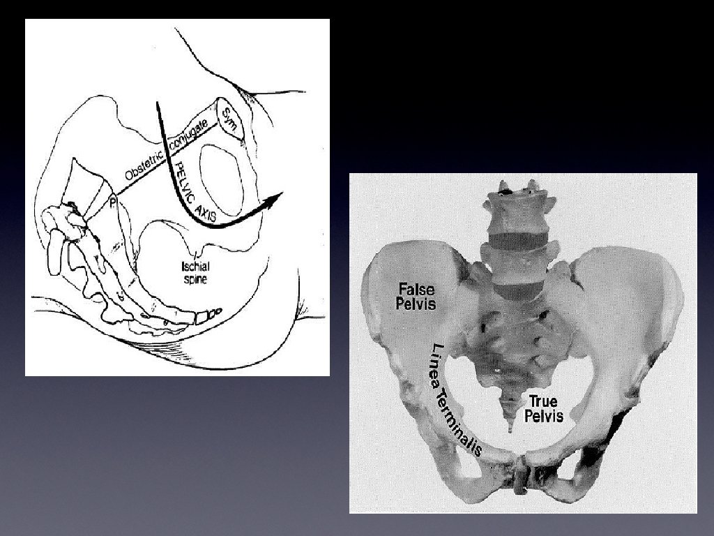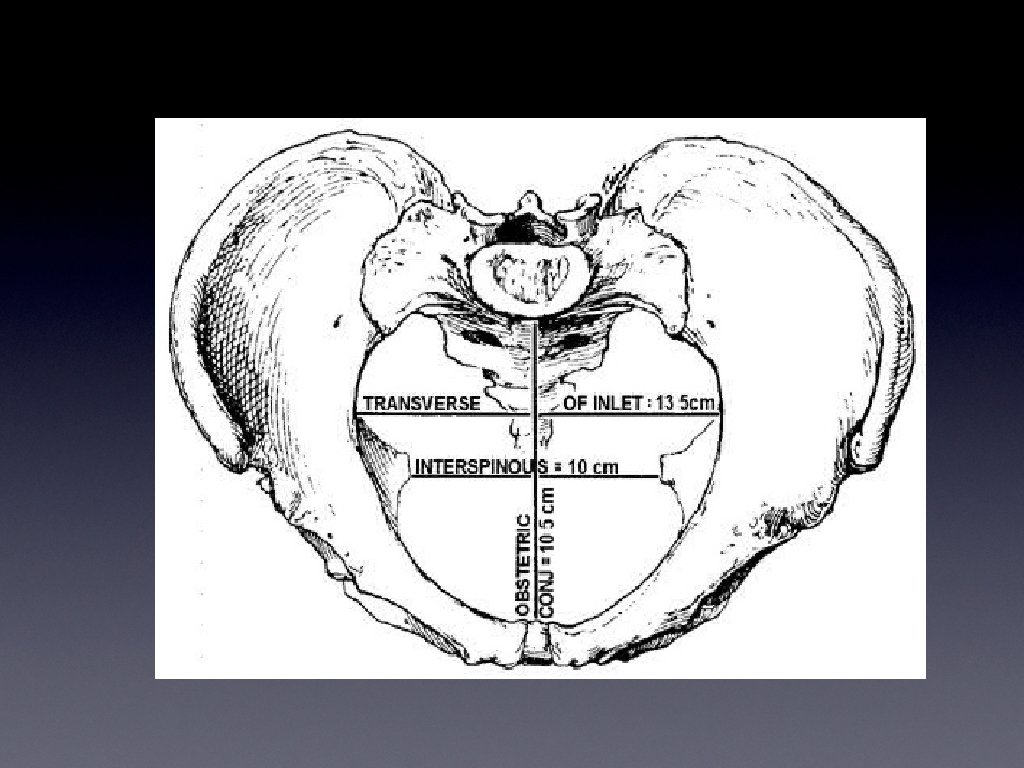• • • La pelvimetrie interna: Strâmtoarea superioara –diametrul promontosuprapubian sau conjugata anatomica, 11 cm –diametrul promontomipubian , sau conjugata vera, diametrul util Pinard 10, 8 cm –diametrul oblic intre eminenta iliopectinee si articulatia sacroiliaca stanga 12, 5 cm dreapta 12 cm –diametrul transvers 12 cm