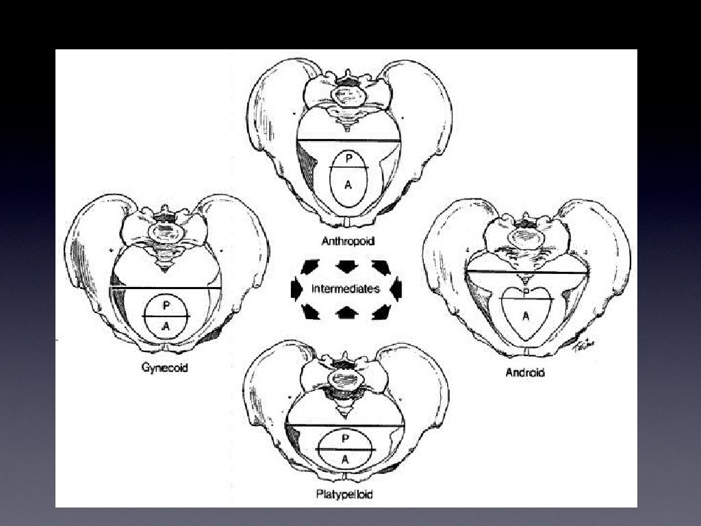 • –tipurile de bazin : • →bazinul ginecoid • • bazin aproape rotund • la nivelul stramtorii superioare ambele diametre transverse egale, diametrul anteroposterior normal • la nivelul stramtorilor mijlocii si medii modificari aproape absente