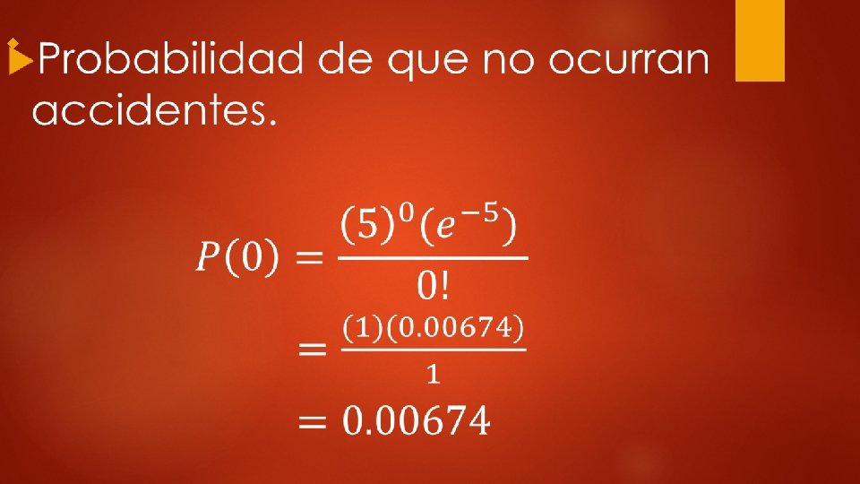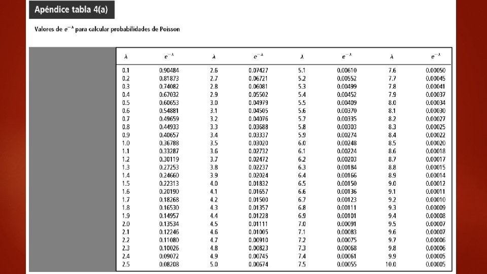 EJEMPLO En una intersección, los registros policiales indican una media de 5 accidentes mensuales. El departamento de Seguridad de Tránsito desea calcular la probabilidad de que en cualquier mes ocurran exactamente 0, 1, 2, 3 ó 4 accidentes.