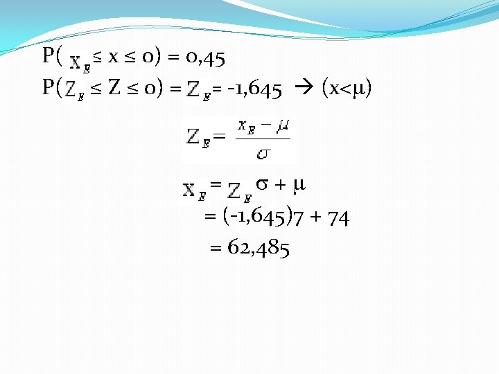 b) P(60≤x≤ 80) = = P(0, 33≤Z≤ 1, 67) = P(0≤Z≤ 1, 67) – P(0≤Z≤ 0, 33) = 0, 4525 – 0, 1293 = 0, 3232 Z 1 = = 0, 33 B = 0, 1293 Z 2 = = 1, 67 A = 0, 4525 C = A – B = 0, 3232