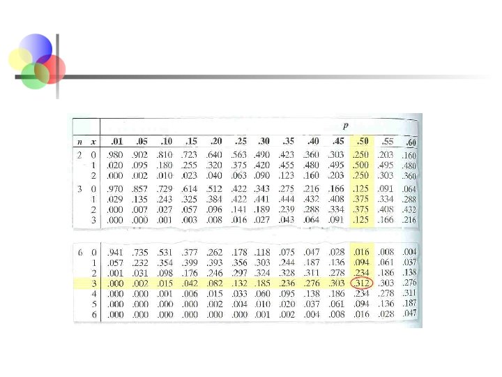 Penggunaan Tabel Binomial n = 10 x p=. 15 p=. 20 p=. 25 p=. 30 p=. 35 p=. 40 p=. 45 p=. 50 0 1 2 3 4 5 6 7 8 9 10 0. 1969 0. 3474 0. 2759 0. 1298 0. 0401 0. 0085 0. 0012 0. 0001 0. 0000 0. 1074 0. 2684 0. 3020 0. 2013 0. 0881 0. 0264 0. 0055 0. 0008 0. 0001 0. 0000 0. 0563 0. 1877 0. 2816 0. 2503 0. 1460 0. 0584 0. 0162 0. 0031 0. 0004 0. 0000 0. 0282 0. 1211 0. 2335 0. 2668 0. 2001 0. 1029 0. 0368 0. 0090 0. 0014 0. 0001 0. 0000 0. 0135 0. 0725 0. 1757 0. 2522 0. 2377 0. 1536 0. 0689 0. 0212 0. 0043 0. 0005 0. 0000 0. 0060 0. 0403 0. 1209 0. 2150 0. 2508 0. 2007 0. 1115 0. 0425 0. 0106 0. 0016 0. 0001 0. 0025 0. 0207 0. 0763 0. 1665 0. 2384 0. 2340 0. 1596 0. 0746 0. 0229 0. 0042 0. 0003 0. 0010 0. 0098 0. 0439 0. 1172 0. 2051 0. 2461 0. 2051 0. 1172 0. 0439 0. 0098 0. 0010 10 9 8 7 6 5 4 3 2 1 0 p=. 85 p=. 80 p=. 75 p=. 70 p=. 65 p=. 60 p=. 55 p=. 50 x Contoh: n = 10, p =. 35, x = 3: P(x = 3|n =10, p =. 35) =. 2522 n = 10, p =. 75, x = 2: P(x = 2|n =10, p =. 75) =. 0004