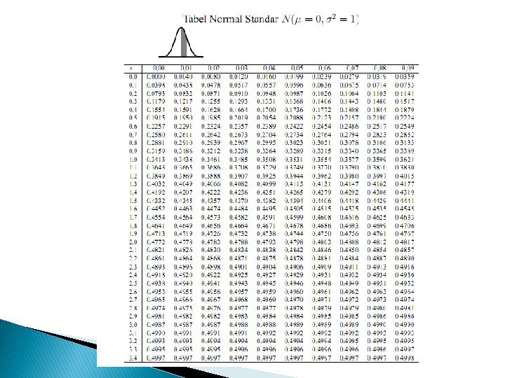 … � Mencari luas daerah pada suatu kurva normal dengan menggunakan tabel: P( 0 ≤ z ≤ a )= nilai tabel a P( z ≥ a )= 0. 5 - nilai tabel a P( z ≥ -a ) = 0. 5 + nilai tabel -a P( z ≤ a )= nilai tabel a + 0. 5 P( a 1 ≤ z ≤ a 2 )= nilai tabel a 2 - nilai tabel a 1 P( a 1 < z < a 2 )= nilai tabel a 2 + nilai tabel a 1