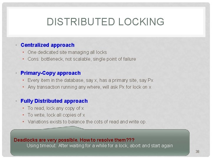 DATABASE LOCKING • Locking mechanisms are used to prevent concurrent transactions from updating the same data at the same time • Reading(x) shared lock on x • Writing(x) exclusive lock on x • More types of locks exist for efficiency What you request What you have Shared lock Exclusive lock Shared lock Yes No Exclusive lock No No In Distributed DBs: • x may be replicated in multiple sites (not one place) • The transactions reading or writing x may be running at different sites 37